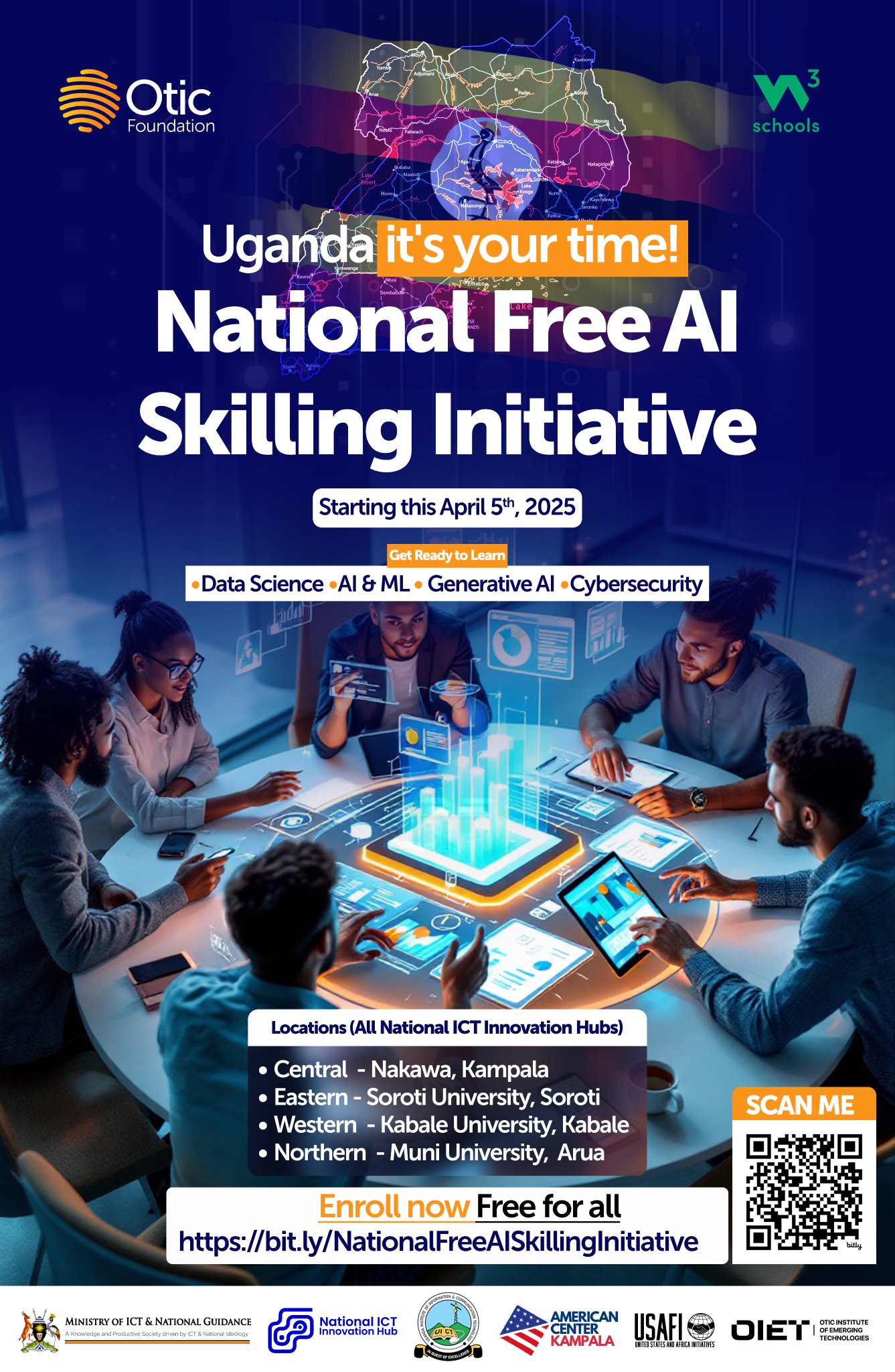 AI is shaping the future, and Uganda must be ready! @OticUganda, in partnership with @w3schoolsonline @MoICT_Ug, and the National ICT Innovation Hub, is launching the National AI Skilling Program, a free training initiative designed to equip Ugandans with the digital skills needed for tomorrow.